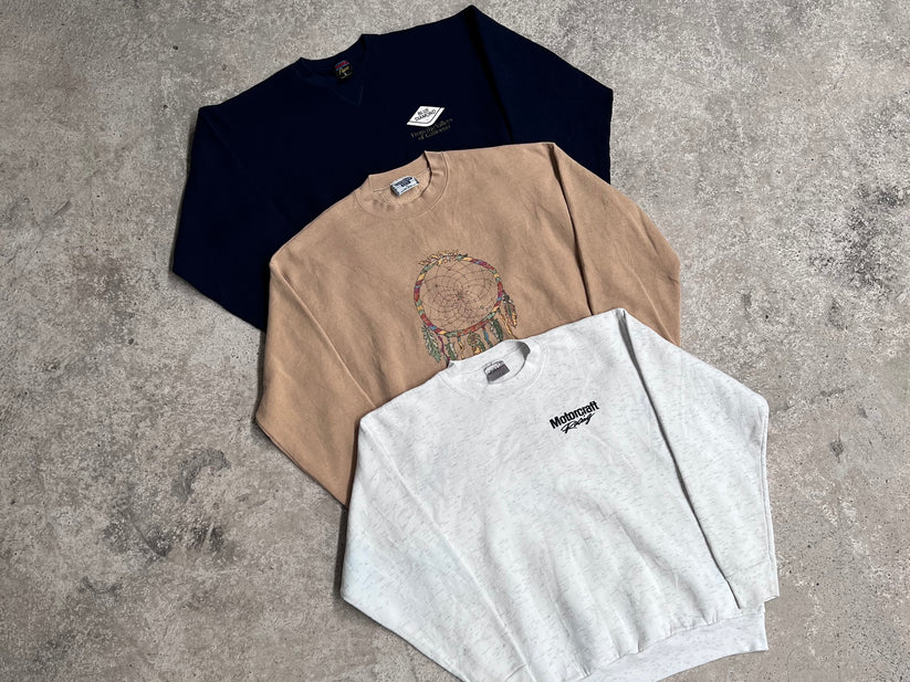 This bundle contains vintages sweatshirts mainly made in USA from the 80’s and 90’s. Some might also be made in Haiti, Mexico, El Salvador, and Honduras. The items may be both unbranded and branded. They  come in different sizes, styles and colors.